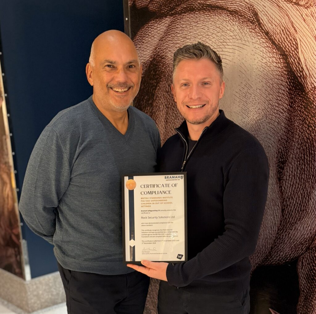 Rock Security has made industry history after being officially awarded certification under the British Standards Institution (BSI) PAS 5222: Safeguarding Children in Out-of-School Settings by Bramah Safeguarding CIC, becoming the first security company to achieve this prestigious safeguarding standard.